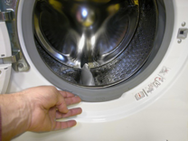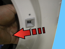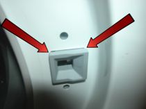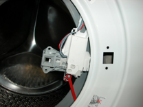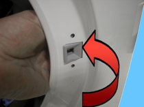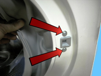 Løsne de to skruene som fester dørens sikkerhetslås til frontpanelet.